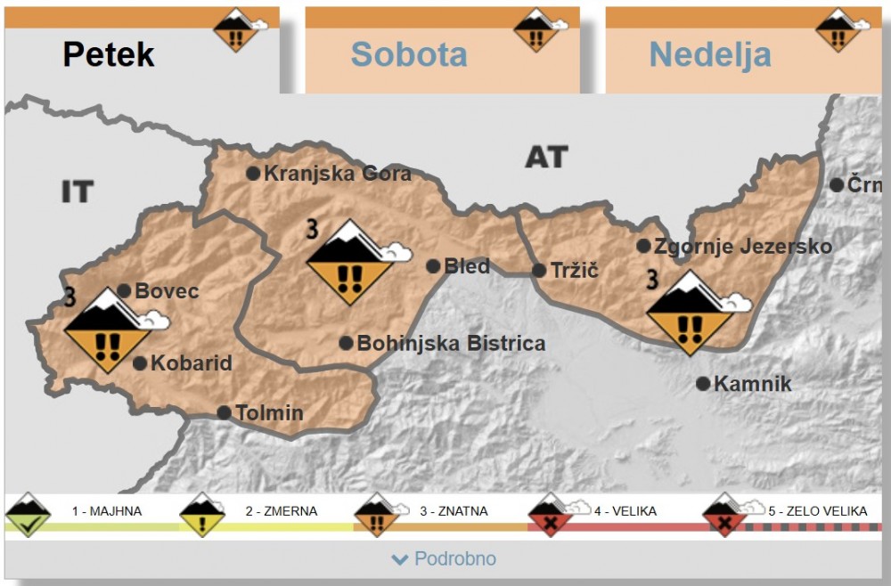 Nevarnost je 3. stopnje po evropski petstopenjski lestvici - ZNATNA. Glavni problem: napihan sneg, nov sneg. Vzorec nevarnosti: Hladno vreme, nesprijet svež sneg z vetrom. Vzorec nevarnosti: Ohladitev po toplem vremenu / otoplitev po mrazu.