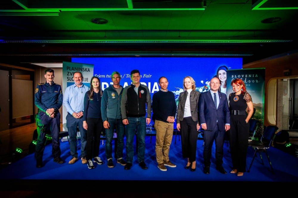 Mag. Bojan Kos, višji samostojni policijski inšpektor, Policija, Martin Šolar, podpredsednik Planinske zveze Slovenije, Veronika Hladnik Zakotnik, vodja oddelka za splošne napovedi na ARSO, Peter Jeromel, predsednik Združenja gorskih vodnikov Slovenije, Klemen Belhar, podpredsednik Gorske reševalne Slovenije, Matej Kandare, direktor združenja Slovenia Outdoor, Aleksandra Jerebic Topolovec, vodja portala slovenia.info na STO, dr. Tit Potočnik, direktor JZ Triglavski narodni park in Marjana Grčman. (foto Siniša Kanižaj/STO)