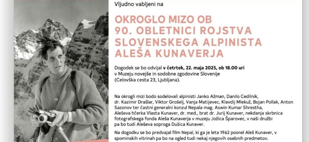 Prijazno vabljeni na okroglo mizo ob 90. obletnici rojstva slovenskega alpinista Aleša Kunaverja, ki bo v četrtek, 22. maja 2025, ob 18. uri, v Viteški dvorani Muzeja novejše in sodobne zgodovine Slovenije v Ljubljani (Celovška cesta 23).