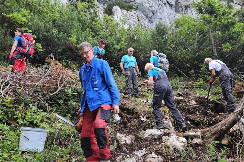 Koroški markacisti so se na povabilo Planinskega društva Kamnik udeležili dvodnevne akcije sanacije planinske poti na Kokrsko sedlo, poškodovane po neurjih. (foto arhiv Draga Kureta)