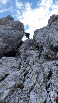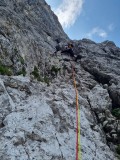 Zadnji Prisojnik, SZ stena, Aleksič - Jurca, IV, 500 m, Jakob Šturm in Erik Pavusa. Smer je bogatejša za 5 klinov.