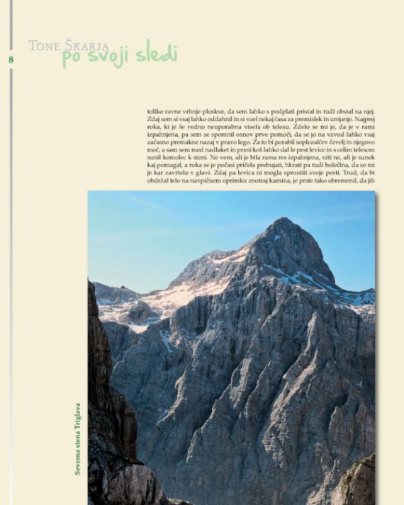 Knjiga Toneta Škarje s pomenljivim naslovom Po svoji sledi je najobsežnejše delo našega uglednega alpinističnega in odpravarskega veljaka, ki je bil pri vseh dogajanjih ves čas zraven pa vendar je vedno hodil povsem po svoji poti.