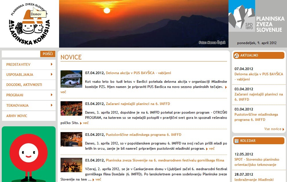 ponedeljek, 9. april 2012, ob 0. uri, ogledov: 5781 Nova spletna stran Mladinske komisije Planinske zveze slovenijeMladi | | Mladinska komisija | | | Objavil(a): Zdenka Mihelič | | Na spletnem naslovu http://mk.pzs.si je začela delovati nova spletna stran Mladinske komisije PZS, na kateri so zbrane novice s področja dela z mladimi in dela mladih. | Na spletnem naslovu http://mk.pzs.si je začela delovati nova spletna stran Mladinske komisije PZS, na kateri so zbrane novice s področja dela z mladimi in dela mladih. Na spletni strani so predstavljeni komisija in njeni člani - mladinski odseki planinskih društev. Tu najdete tudi podrobnejše informacije o posameznih usposabljanjih (mladinski voditelji, mentor planinskih skupin ...), o nacionalnih programih komisije - Ciciban planinec, Mladi planinec, Planinska šola - ter o planinskih taborih. Na strani najdete tudi vse informacije o tekmovanjih, ki jih komisija organizira skupaj z lokalnimi društvi: o šolskem športnem tekmovanju Mladina in gore in o tekmovanjih iz planinske orientacije.