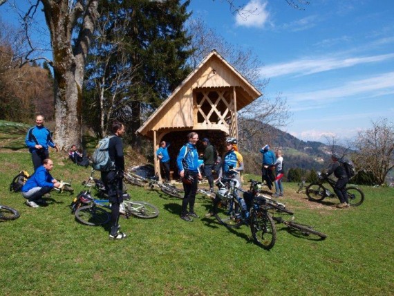 Štirje udeleženci so izbrali lažji spust, ostali pa smo uživali na serpentinasti gozdni vlaki do stičišča s cesto, kjer smo se zopet združili. Nadaljevali smo po asfaltu do vasice Javorje, kjer smo si privoščili še malce oddiha pred vzponom proti Žetini, kjer smo nato zavili levo proti Malenskemu vrhu oz. cerkvi Marijinega vnebovzetja na Gori. Najvišja točka ture je bila tako dosežena in prepustili smo se sončnim žarkom. Občudovali smo nov kozolec, ki je nadomestil prejšnjega in pod katerim se da tudi lepo posedeti, zgoraj na podu pa tudi udobno bivakirati. V pisali smo se še v vpisno knjigo in sledil je še glavni spust do vasice Zakobiljek. Del skupine je zopet izkoristil lažjo možnost, ostali pa smo testirali brezhibnost zavor na na trenutke kar zahtevnem spustu.