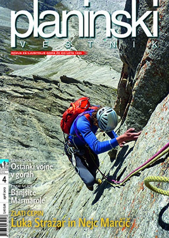 OSTANKI VOJNE V GORAH 4 Kdo je postavil tiste kamne? Ko vojna zaide tudi v gore. Marjan Bradeško V Posočju še danes hodimo po njih. Mulatjere. Dušan Škodič Alpski zid. Italijanski utrdbeni sistem ob rapalski meji. Karla Kofol Impresivna tetralogija o soški fronti. Pogovor z Vasjem Klavoro. Marjan Bradeško MINIATURA 15 Čas barv in barve časa. Mulatjera na Cregnedul. Aleš Nosan INTERVJU 16 V gorah in potovanjih je smisel življenja. Pogovor z Andrejem Ercegom. Maja Duh SLOVENIJI ZLATI CEPIN 2012 20 Sanjači zlatih jam v K7 West. Plezala Luka Stražar in Nejc Marčič. Zdenka Mihelič ALPINISTIČNA ODPRAVA V KARAKORUM 22 Uspešno izpeljana ideja. Slovenska prvenstvena smer na K7. Luka Stražar Utrinki s plezanja in iz življenja v pakistanskih gorah. Charakusa. David Debeljak MANJ ZNANI DOLOMITI 26 Srce Agnèrja. Zanimivo okno v Cimi dei Balconi. Franci Horvat