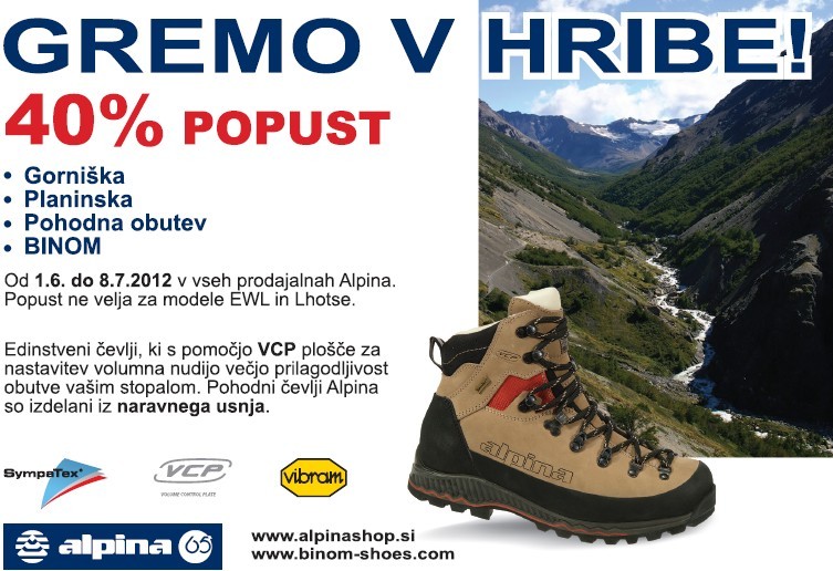 petek, 1. junij 2012, ob 0. uri, ogledov: 3758 Alpinina akcija: še bolj dostopne cene pohodnih čevljevSplošno | | | Objavil(a): Zdenka Mihelič | | Alpina sporoča, da so v času od 1. 6. do 8. 7. 2012 pripravili posebno ponudbo pohodnih čevljev - velja v vseh rednih prodajalnah Alpine. Več: | 40 % POPUST na določeno MODNO OBUTEV, TORBICE ALPINA ter POHODNO OBUTEV. Izbirate lahko med pestro ponudbo kakovostne obutve za gorništvo, planinarjenje in prosti čas.