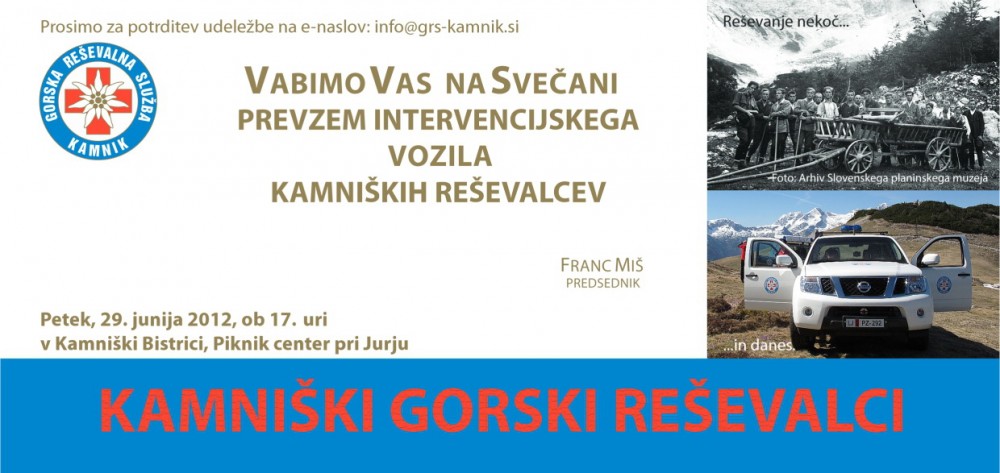 Vabimo vas na svečani prevzem intervencijskega vozila kamniških gorskih reševalcev, ki bo v petek, 29. junija 2012, ob 17. uri, pri Jurju v Kamniški Bistrici. Vabljeni!