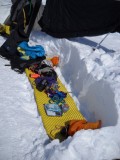 Kratek opis: Verjetno je poteku odprave botrovalo več razlogov. Predvsem prva polovica odprave je bila zaznamovana z izjemno nizkimi temperaturami, tudi za ta letni čas, in slabim vremenom. Tudi izbira termina odprave že sama po sebi za želeni cilj (Cassinov greben v Denaliju) ni bila ravno optimalna, naveze za to smer so začele prihajati v področje šele ko sva se z Maticem odpravljala domov. To sva vedela že v naprej, vendar pa so nama izbiro termina določale tudi študijske obveznosti, tako sva upala, da se bo nekako vseeno izšlo. Poleg tega sem v prvi polovici bivanja zbolel, in v kakšnem prestavljanju v višje tabore pod Denali v nikakršnem primeru ne bi bilo govora. Prvo ugodno vremensko okno sva nato izkoristila za plezanje v Mt. Hunterju, raje kot da bi nadaljevala proti kampu 14 000 pod Denalijem, saj sva bila za priprave in single-push plezanje Cassina že prepozna, tudi če bi vreme držalo do konca odprave. V smeri se je izkazalo, da mi je teden ležanja v šotoru z vročino pobral več moči, kot sem si mislil, tako da sva se odločila za povratek. Na predzadnjem spustu z vrvjo naju je še za nekaj minut objel oblak pršiča iz bližnjega velikega pršnega plazu, ob povratku v bazo pa Matic ni mogel več obremeniti noge zaradi kosa ledu, ki ga je zadel v koleno že na prvem sidrišču v smeri. Sledil je še teden dni življenja v bazi in plezanja (Matic pa je moral mirovati), nato pa povratek v dolino, 3 dni pred predvidenim, za kar sva se odločila zaradi prihajajočega vremenskega poslabšanja, ki ti lahko onemogoči odhod, ko ga imaš predvidenega. Ves čas odprave smo v bazi bivali skupaj z drugo slovensko odpravo, Blažem Navršnikom in Matjažem Dušičem. Ocena odprave: Na ledeniku smo se zadrževali dobre tri tedne, v tem času sva z Maticem splezala vsak po 2 smeri, ki v tem področju veljajo za lažje, med zares plezalnimi seveda, dostopov po normalkah je še veliko. Prav tako se nisva glavnega cilja, to je Južna stena Denalija, niti dotaknila. Tako gledano je bila odprava precej neuspešna.