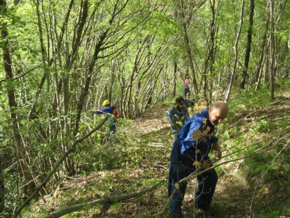 zapuščenih poteh pa sta na čelu skupine dva izkušena kolega z motorno žago,
