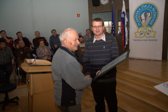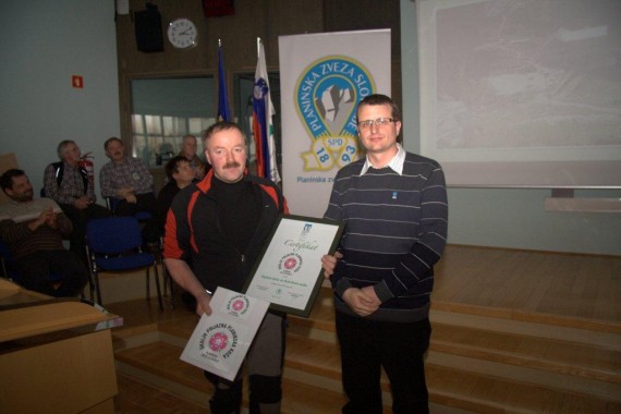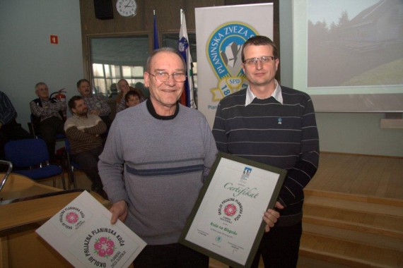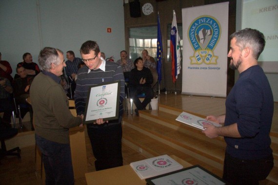 Na slovesni podelitvi prvih certifikatov Okolju prijazna planinska koča s predsednikom PZS Bojanom Rotovnikom (spredaj levo) in načelnikom Gospodarske komisije PZS Alešem Glavnikom (drugi z desne v drugi vrst), foto Matej Planko