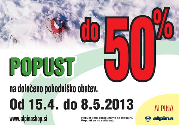 ponedeljek, 15. april 2013, ob 0. uri, ogledov: 3079 Alpina, april-maj 2013: do 50 % popust na pohodniško obutevSplošno | | | Objavil(a): Zdenka Mihelič | | V času med 15. aprilom in 8. majem 2013 Alpina nudi do 50-odstotni POPUST NA določeno POHODNO OBUTEV. Akcija velja v vseh prodajalnah Alpina, tudi v Alpina diskontih. | V času med 15. aprilom in 8. majem 2013 Alpina nudi do 50-odstotni POPUST NA določeno POHODNO OBUTEV. Akcija velja v vseh prodajalnah Alpina, tudi v Alpina diskontih.