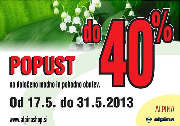 petek, 17. maj 2013, ob 0. uri, ogledov: 3753 Alpina - do 40 % popust na pohodniško obutevSplošno | | | Objavil(a): Zdenka Mihelič | | V času med 17. in 31. 5. 2013 nudi Alpina do 40 % popust na določeno žensko, moško in otroško modno obutev ter na določeno pohodno obutev Alpina. Akcija velja v vseh rednih prodajalnah Alpina. | V času med 17. in 31. 5. 2013 nudimo DO 40 % POPUST na določeno žensko, moško in otroško modno obutev ter na določeno pohodno obutev Alpina. Akcija velja v vseh rednih prodajalnah Alpina.