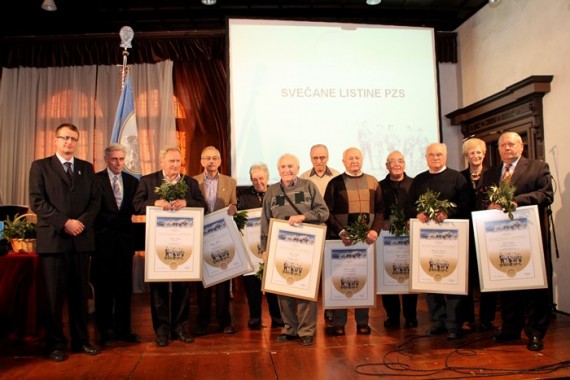Prejemniki spominskih plaket PZS za 60 in 65 let s podeljevalci plaket