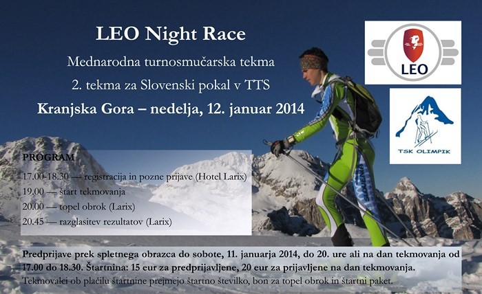 torek, 24. december 2013, ob 0. uri, ogledov: 3142 Razpis: LEO Night Race, 2. tekma za Slovenski pokal v TTS 2014 - ODPADEGorski športi | | Komisija za gorske športe | | Društvo Olimpik | | | Objavil(a): Zdenka Mihelič | | TSK Olimpik vabi v nedeljo, 12. januarja 2014, na mednarodno turnosmučarsko tekmo v Kranjsko Goro 'LEO Night Race' - 2. tekmo za SLOVENSKI POKAL v tekmovalnem turnem smučanju 2014. | Kranjska Gora - nedelja, 12.