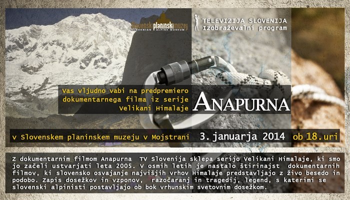 sobota, 28. december 2013, ob 0. uri, ogledov: 2598 Predpremiera dokumentarnega filma AnapurnaPlaninska kultura | Alpinizem | | Komisija za alpinizem | | | Objavil(a): Zdenka Mihelič | | Slovenski planinski muzej in TV Slovenija, Izobraževalni program, vas vljudno vabita na predpremiero dokumentarnega filma iz serije Velikani Himalaje - Anapurna, ki bo v SPM v Mojstrani v petek, 3. januarja 2014, ob 18. uri. |  |