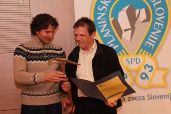 V imenu odsotnega Martina Žumra, najperspektivnejšega alpinista za 2013, nagrado in cepin prevzel njegov oče