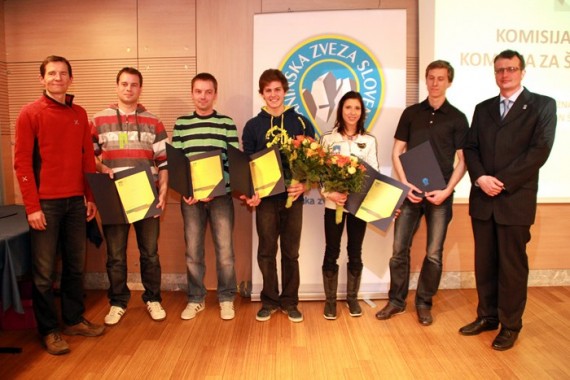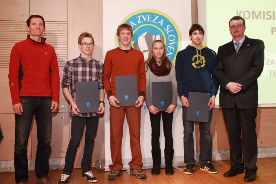 Z leve predsednik PZS Bojan Rotovnik, najuspešnejša alpinistka Anastasija, v imenu odsotnega Luke Krajnca, najuspešnejšega alpinista za 2013, je nagrado prevzela njegova mama; desno načelnik KA PZS Miha Habjan