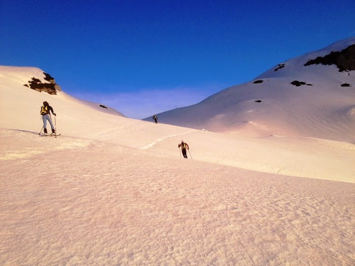 za Velsko dolino. V njej nas čaka popolna spomladanska smuka s soncem, ki nas
