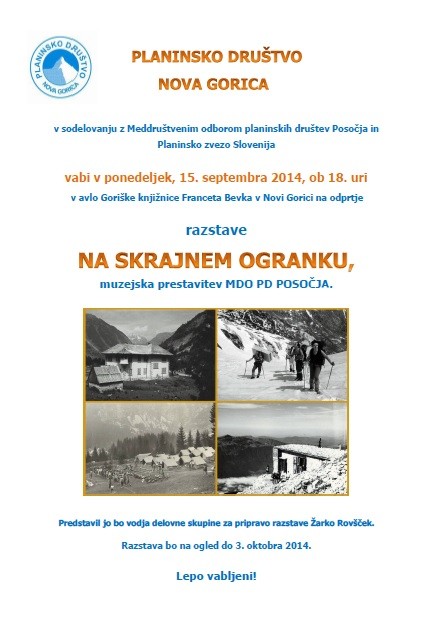 ponedeljek, 8. september 2014, ob 0. uri, ogledov: 3204 Na skrajnem ogranku - tokrat razstava gostuje v Novi GoriciDruštva | Planinska kultura | Splošno | | Planinsko društvo Nova Gorica | | | Objavil(a): Matej Ogorevc | | V ponedeljek, 15. septembra 2014, ob 18.00 uri ste vabljeni na kratko slovesnost ob odprtju razstave MDO PD Posočja »Na skrajnem ogranku«. | Otvoritev razstave, ki jo gosti knjižnica Franceta Bevka Nova Gorica bo na ogled vse do 3. oktobra. Razstava je delo delovne skupine Meddruštvenega odbora planinskih društev Posočja v sestavi Slavka Murovec iz PD Nova Gorica, Irene Šinkovec iz PD Ajdovščina, Anke Vončina iz PD Idrija in Olge Zgaga iz PD Podbrdo in vodje Žarko Rovščka iz PD Tolmin. Razstava nosi naslov Na skrajnem ogranku, ki je izluščen iz pesmi Planine ob meji Ludvika Zorzuta. Pri tem jo je vodilo dejstvo, da predstavljena društva dejansko vseskozi delujejo na obeh straneh skrajnega ogranka naše domovine, saj v njihovi družbi srečamo tudi Slovensko planinsko društvo Gorica in Planinsko družino Benečije. Bogato zgodovino njihovega delovanja od začetkov do konca druge vojne in povojni razvoj do današnjih dni je strnila na devetnajst panojev. Vsak izmed njih nas nagovarja s tematskim naslovom in z izbranim besedilom ali verzom domoljubne vsebine.