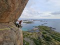 Lofoti so otočje na severnem delu Norveške in slovijo po izjemno lepi kombinaciji nizkih strmih hribov, obdanih z morjem. Z Anjo sva se na pot odpravila z avtom in že vožnja je sama po sebi dogodivščina. Videla sva veliko različne pokrajine, najbolj pa nama bodo verjetno v spominu ostali losi in severni jeleni, ki se po švedskih cestah sprehajajo ponoči bolj pogosto, kot se vozijo avti. V treh dneh nama je uspelo priti na začetek Lofotov, četrti dan pa sva blizu vasice Henningsvær že lahko plezala. Zagnala sva se v 100 metrov dolge smeri in splezala 3 tako, da sva dobila nekaj občutka za granit in način plezanja, smeri pa so bile vse tri res uživaške, samo malo kratke. |