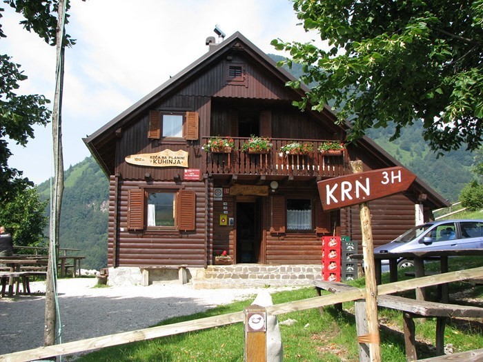 Koča stoji na spodnjem robu planine Kuhinja, ene od petih planin ob vznožju strmih južnih pobočij Krna nad razloženo gorsko vasico Krn. PD Kobarid se je že leta 1974 odločilo, da bo zgradilo planinsko postojanko v osrčju petih planin pod Krnom. Leta 1980 so na planino napeljali elektriko in začeli s pripravami za gradnjo, graditi pa so začeli leta 1982. Kočo so odprli 3. junija 1984. Leta 1987 so zgradili še prizidek za sanitarije. V kočo je 6. avgusta 1994 udarila strela in je do tal pogorela. Na njenem mestu so zgradili novo kočo, ki so jo leta 2019 razširili s prizidkom.