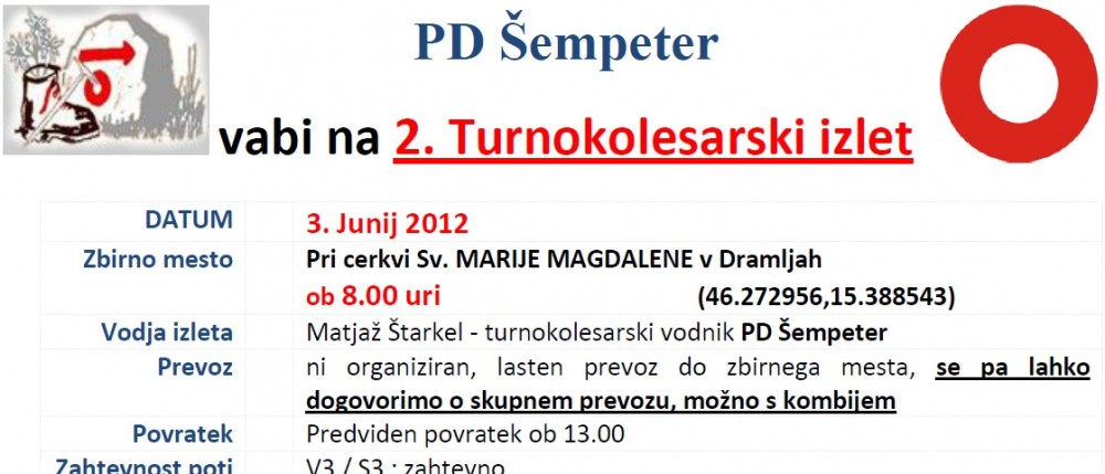 | Komisija | Komisija za turno kolesarstvo | Organizator | PD Šempeter v sodelovanju s PD Dramlje | Vodnik / kontakt | Matjaž Štarkel, turnokolesarski vodnik PD Šempeter | Prijave | prijava je obvezna, sprejema jih: Matjaž Štarkel - 041 762 208 ali matjaz.starkel@gmail.com | Težavnost | Zahtevnost poti: V3 / S3; zahtevno | Višinska razlika | Višinska razlika in dolžina: ~1000 m / 35 km | Način prevoza | ni organiziran, lasten prevoz do zbirnega mesta, se pa lahko dogovorimo o skupnem prevozu, možno s kombijem | Oprema / dokumenti | Obvezna: - gorsko kolo z profiliranimi gumami, čelada, kolesarske rokavice ter vetrovka; planinska izkaznica s plačano članarino za tekoče leto.