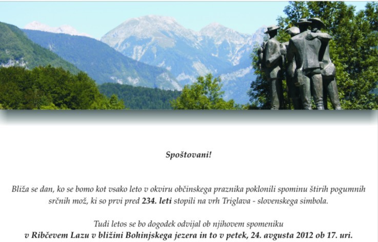 | Organizator | Planinsko društvo Srednja vas, Planinsko društvo Boh. Bistrica, Planinsko društvo Gorje, Planinsko društvo, Bled Planinska zveza Slovenije, Občina Bohinj | Bliža se dan, ko se bomo kot vsako leto v okviru občinskega praznika poklonili spominu štiri pogumnih srčnih mož, ki so prvi pred 234. leti stopili na vrh Triglava -slovenskega simbola.
