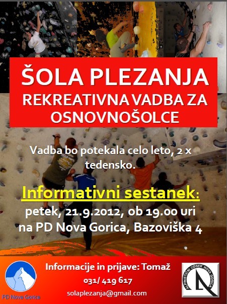 Šola rekreativnega plezanja za osnovnošolce - informativni sestanek | Vrsta dogodka | Športno plezanje | Kdaj | 21. 9. 2012 ob 19. uri v prostorih PD Nova Gorica, Bazoviška 4, Nova Gorica | Kje | Nova Gorica | Društvo | Planinsko društvo Nova Gorica | Vodnik / kontakt | Tomaž Cingerle, 031 419 617 | Informacije | info in prijave: solaplezanja@gmail.com Tomaž Cingerle, 031 419 617 | ŠOLA PLEZANJA REKREATIVNA VADBA ZA OSNOVNOŠOLCE
