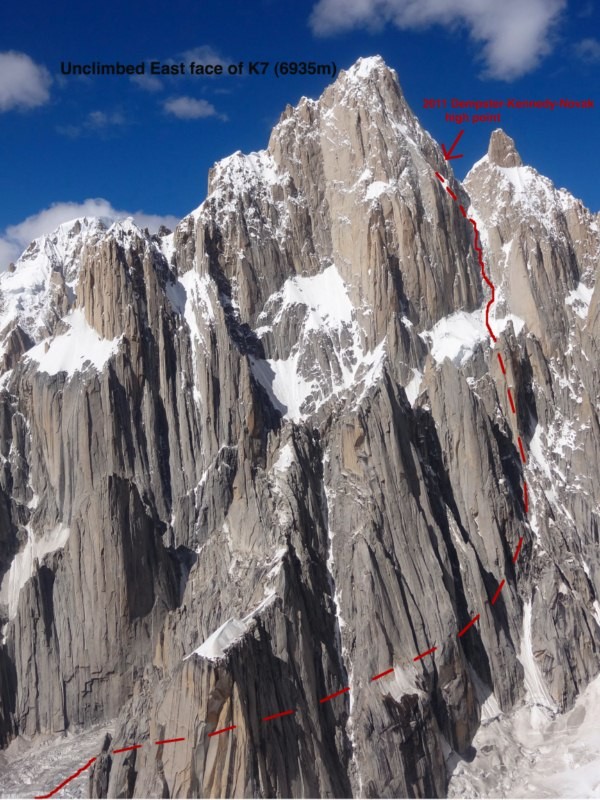 V vzhodni steni, v vpadnici vrha pa so leta 2011 poizkusili prav tokratni člani odprave K7 2012 Kyle Dempster, Hayden Kennedy in Urban Novak. Na višini okoli 6200-6300 m so takrat morali obrniti zaradi poslabšanja vremena.