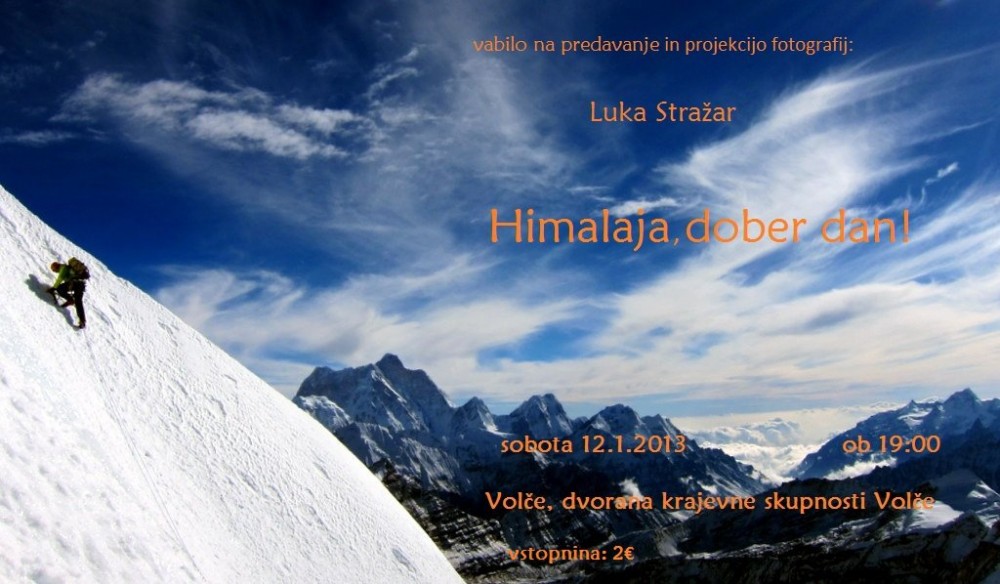 Himalaja, dober dan! | Vrsta dogodka | Srečanje | Kdaj | 12. 1. 2013 ob 19. uri | Kje | v dvorani krajevne skupnosti Volče | Cena | vstopnina 2 € |