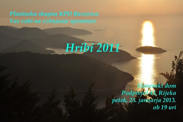 Hribi 2011 s KPD Bazovica z Reke | Vrsta dogodka | Srečanje | Območje | Tujina | Kdaj | 25. 1. 2013 ob 19. uri | Kje | v veliki dvorani Slovenskega doma KPD Bazovica na Reki, Podpinjol 43 | Organizator | Slovenski dom KPD Bazovica | Planinci PS KPD Bazovica vabijo vse, ki imajo radi naravo, in tudi tiste ki so se družili ali bi se želeli družiti s planinsko skupino Bazovice, na skupno potovanje po hribih ki smo jih obiskali v letu 2011.