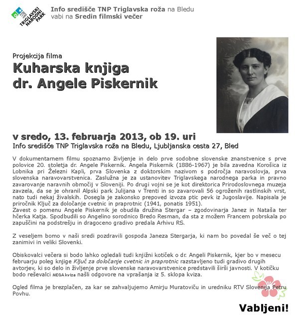Film o dr. Angeli Piskernik - Kuharska knjiga dr. Angele Piskernik | Vrsta dogodka | Srečanje | Kdaj | 13. 2. 2013 ob 19. uri | Kje | v Info središču TNP Triglavska roža na Bledu, Ljubljanska c. 27, Bled | Organizator | Triglavski narodni park | Cena | Vstopnine ni. |