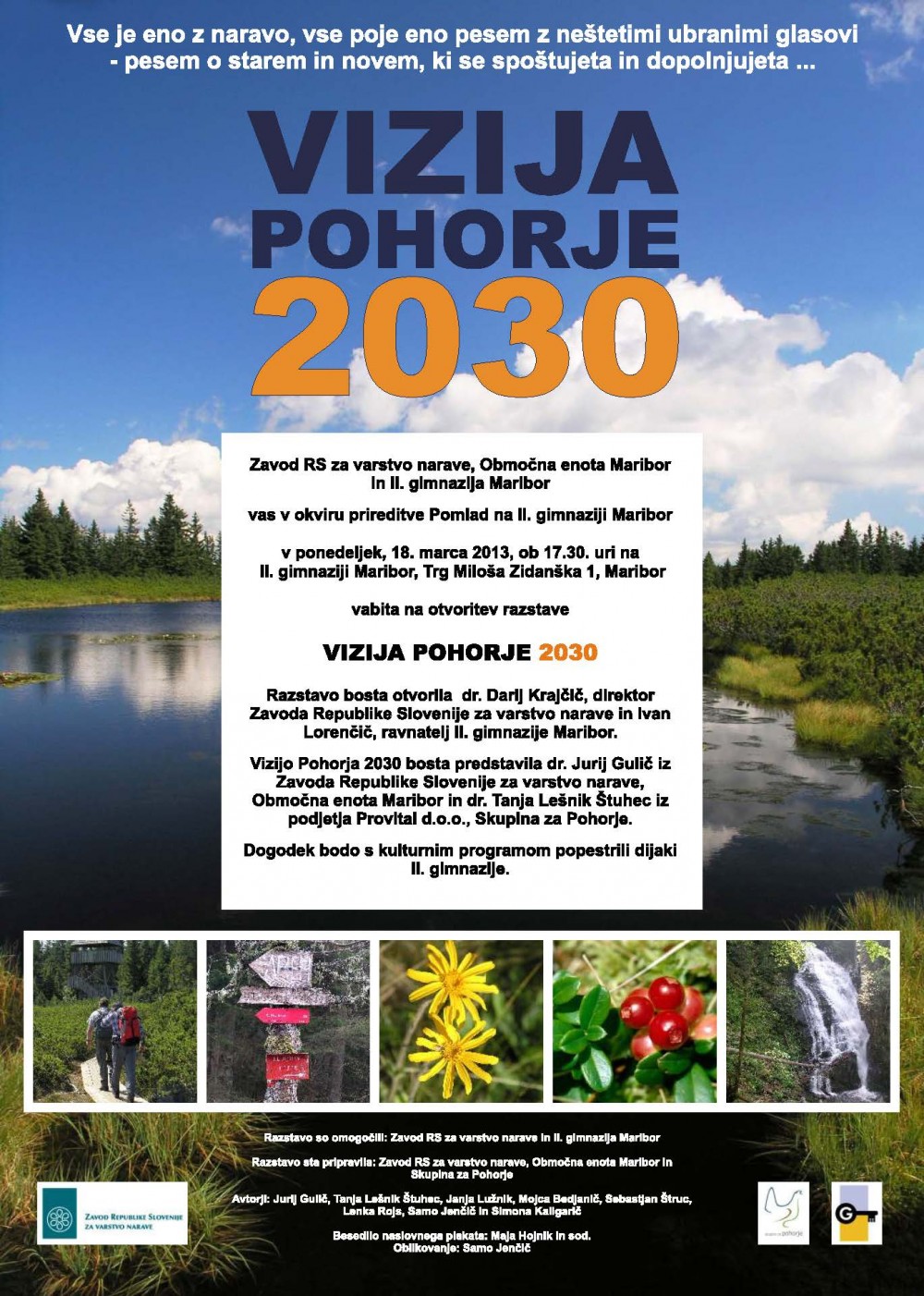 18. 3. 2013, ogledov: 1997Vizija Pohorje 2030, odprtje razstave | Kdaj | 18. 3. 2013 ob 17.30 | Kje | na II. gimnaziji Maribor, Trg Miloša Zidanška 1, Maribor |