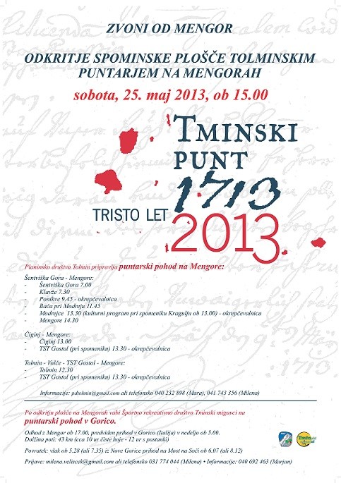 25. 5. 2013 / Pohod, ogledov: 2193Zvoni od Mengor - odkritje spominske plošče tolminskim puntarjem na Mengorah | Vrsta dogodka | Pohod | Kdaj | 25. 5. 2013 ob 7. uri | Društvo | Planinsko društvo Tolmin | Organizator | PD Tolmin, Občina Tolmin | Prijave | do četrtka, 23. 5. 2013 | Informacije | pdtolmin@gmail.com, 040 232 898 (Mara), 041 743 356 (Milena), pisarna PD Tolmin 23. 5. 2013 ob 18.30.