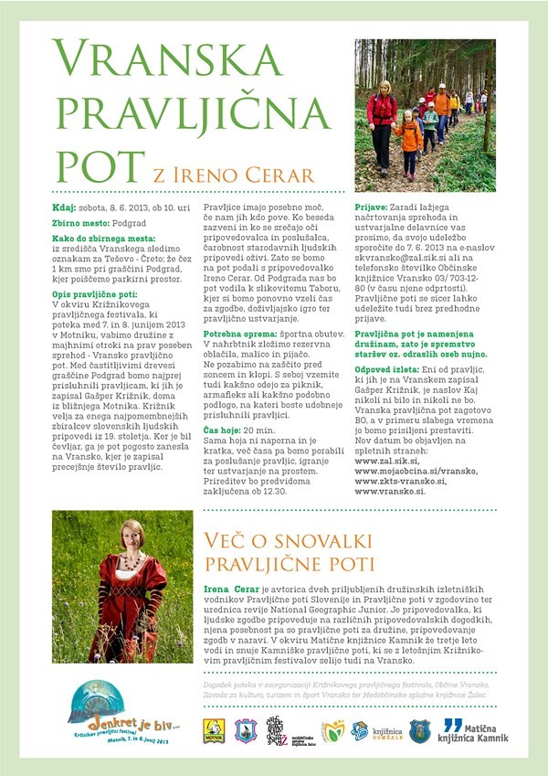 Vranska pravljična pot z Ireno Cerar | Vrsta dogodka | Srečanje | Kdaj | 8. 6. 2013 ob 10. uri | Prijave | Zaradi lažjega načrtovanja sprehoda in ustvarjalne delavnice vas prosimo, da svojo udeležbo sporočite do 7. 6. 2013 na e-naslov skvransko@zal.sik.si ali na telefonsko številko Občinske knjižnice Vrans | Primernost | Pravljična pot je namenjena družinam, zato je spremstvo staršev oz. odraslih oseb nujno. Primerno za družine | Trajanje/dolžina | 20 min. Sama hoja ni naporna in je kratka, več časa pa bomo porabili za poslušanje pravljic, igranje ter ustvarjanje na prostem. | Oprema / dokumenti | Športna obutev, v nahrbtnik zložimo rezervna oblačila, malico in pijačo. Ne pozabimo na zaščito pred soncem in klopi. S seboj vzemite tudi kakšno odejo za piknik, armafleks ali kakšno podobno podlogo, na kateri boste udobneje prisluhnili pravljici. | V okviru Križnikovega pravljičnega festivala, ki poteka med 7. in 8. junijem 2013 v Motniku, vabimo družine z majhnimi otroki na prav poseben sprehod - Vransko pravljično pot. Med častitljivimi drevesi graščine Podgrad bomo najprej prisluhnili pravljicam, ki jih je zapisal Gašper Križnik, doma iz bližnjega Motnika. Križnik velja za enega najpomembnejših zbiralcev slovenskih ljudskih pripovedi iz 19. stoletja. Ker je bil čevljar, ga je pot pogosto zanesla na Vransko, kjer je zapisal precejšnje število pravljic.