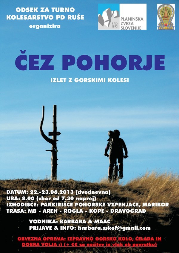 Turnokolesarska tura Čez Pohorje | Vrsta dogodka | Turnokolesarska tura | Območje | Gričevja in hribovja severovzhodne Slovenije | Kdaj | 22. 6. 2013 ob 8. uri | Traja do | 23. 6. 2013 (2 dni) | Kje | izpod Pohorske vzpenjače v Mariboru (odhod) | Društvo | Planinsko društvo Ruše | Komisija | Komisija za turno kolesarstvo | Organizator | PD Ruše | Prijave | Obvezne prijave na barbara.sskof@gmail.com do 19. 6. 2013 do 12 h. | Informacije | barbara.sskof@gmail.com ali na 051 606 997 (Maac) | Težavnost | kondicijsko in tehnično zelo zahtevna tura | Pot | Označena pot | Višinska razlika | 1. dan ca. 2200 m, 2. dan 1300 m vzpona | Cena | Predvideni stroški: min. 5€ za enolončnico, min. 6€ nočitev za člane PZS na skupnih ležiščih, vlak Dravograd - Maribor 5,48€, prevoz koles 3,20€ | Oprema / dokumenti | Izpravno gorsko kolo s profiliranimi gumami, čelada, rokavice, energetskopolna hrana, dovolj vode, orodje, rezervna zračnica, vetrovka, rezervna oblačila ... | Spoštovane kolesarke, spoštovani kolesarji, ljubitelji narave in turnega kolesarstva! Z velikim veseljem vas vabim, da se pridružite Turnokolesarskemu odseku PD Ruše na prvi dvodnevni turi 'ČEZ POHORJE'. V soboto 22. 6. 2013, se bomo ob 8.00 izpod Pohorske vzpenjače v Mariboru podali proti Arehu, nato pa na zahod v smeri Ribniške koče, kjer bomo prespali, si nabrali novih moči. Naslednji dan, po zajtrku, bomo nadaljevali prečenje v smeri Dravograda. V Maribor se vrnemo z vlakom, iz Dravograda pelje ob 18.05, v Mariboru bomo nekaj čez 19.30. Koče na poti: http://www.pzs.si/koce.php?pid=207