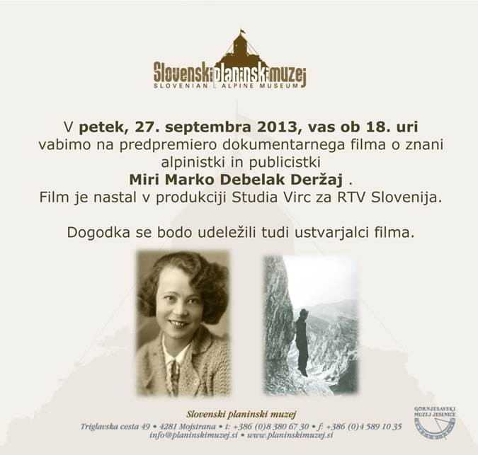 Mira Marko - dokumentarni portret, predpremiera | Vrsta dogodka | Srečanje | Kdaj | 27. 9. 2013 ob 18. uri | Kje | v Slovenskem planinskem muzeju | Organizator | Slovenski planinski muzej, Sturio Virc, PZS | Več >>> |