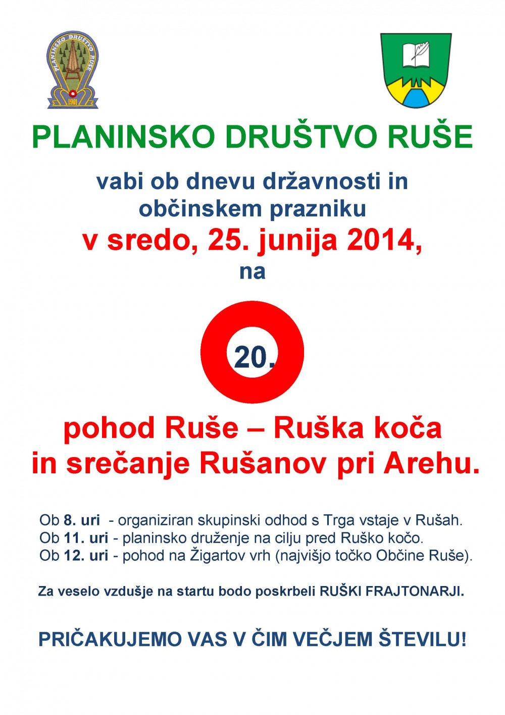 25. 6. 2014 / Pohod, ogledov: 216720. pohod Ruše-Ruška koča ob dnevu državnosti in srečanje Rušanov pri Arehu | Vrsta dogodka | Pohod | Območje | Gričevja in hribovja severovzhodne Slovenije | Kdaj | 25. 6. 2014 ob 8. uri | Kje | Ruše - Trg vstaje | Društvo | Planinsko društvo Ruše | Organizator | PLANINSKO DRUŠTVO RUŠE | Vodnik / kontakt | Franček Hribernik | Informacije | Franček Hribernik, 041 842 880 | Težavnost | Lahka | Pot | Označena pot | Primernost | Primerno za družine | Višinska razlika | 900 m | Trajanje/dolžina | 5 ur | Oprema / dokumenti | za sredogorje | Ob 8. uri - organiziran skupinski odhod s Trga vstaje v Rušah. Ob 11. uri - planinsko druženje na cilju pred Ruško kočo. Ob 12. uri - pohod na Žigartov vrh (najvišjo točko Občine Ruše).