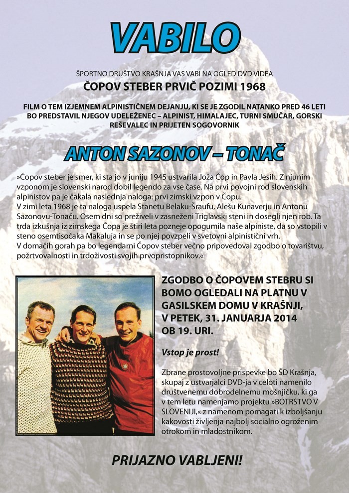 Čopov steber prvič pozimi 1968 in Anton Sazonov - Tonač | Vrsta dogodka | Srečanje | Kdaj | 31. 1. 2014 ob 19. uri | Kje | v gasilskem domu v Krašnji | Organizator | Športno društvo Krašnja | Cena | Vstop prost. |