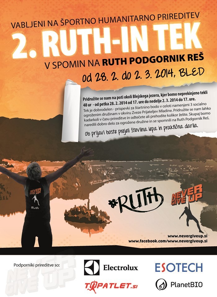 Humanitarni tek: 2. Ruth-in tek | Vrsta dogodka | Srečanje | Kdaj | 28. 2. 2014 ob 17. uri | Traja do | 2. 3. 2014 (3 dni) ob 17. uri | Kje | Štartno-ciljni prostor bo v veslaškem centru Mala Zaka | Organizator | Društvo Vztrajaj - Never give up |