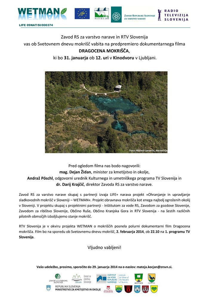 Pred ogledom filma nas bodo nagovorili: mag. Dejan Židan, minister za kmetijstvo in okolje, Andraž Pöschl, odgovorni urednik Kulturnega in umetniškega programa TV Slovenija in dr. Darij Krajčič, direktor Zavoda RS za varstvo narave. Zavod RS za varstvo narave skupaj s partnerji izvaja LIFE+ narava projekt »Ohranjanje in upravljanje sladkovodnih mokrišč v Sloveniji - WETMAN«. Projekt obravnava mokrišča kot enega najbolj ogroženih okolij v Sloveniji. V projektu skupaj s projektnimi partnerji - Inštitutom za vode RS, Zavodom za gozdove Slovenije, Zavodom za ribištvo Slovenije, Občino Ruše, Občino Kranjska Gora in RTV Slovenija - na šestih različnih pilotnih območjih izboljšujemo stanje mokrišč. RTV Slovenija je v okviru projekta WETMAN o mokriščih posnela polurni dokumentarni film Dragocena mokrišča.