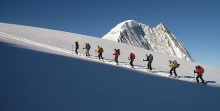 popotovanje na smučeh preko številnih alpskih ledenikov, prelazov in