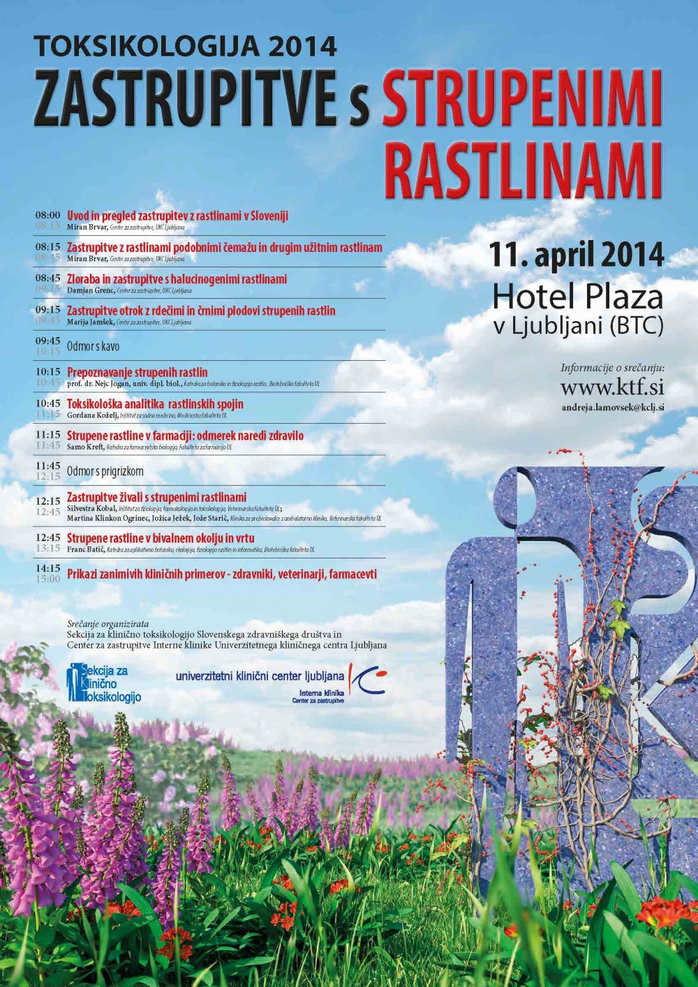 Toksikologija 2014: zastrupitve s strupenimi rastlinami | Vrsta dogodka | Srečanje | Kdaj | 11. 4. 2014 | Kje | hotel Plaza v Ljubljani (BTC City) | Organizator | Sekcija za klinično toksikologijo SZD in Center za zastrupitve UKC Ljubljana | Informacije | miran.brvar@kclj.si, 041-605-420, www.ktf.si