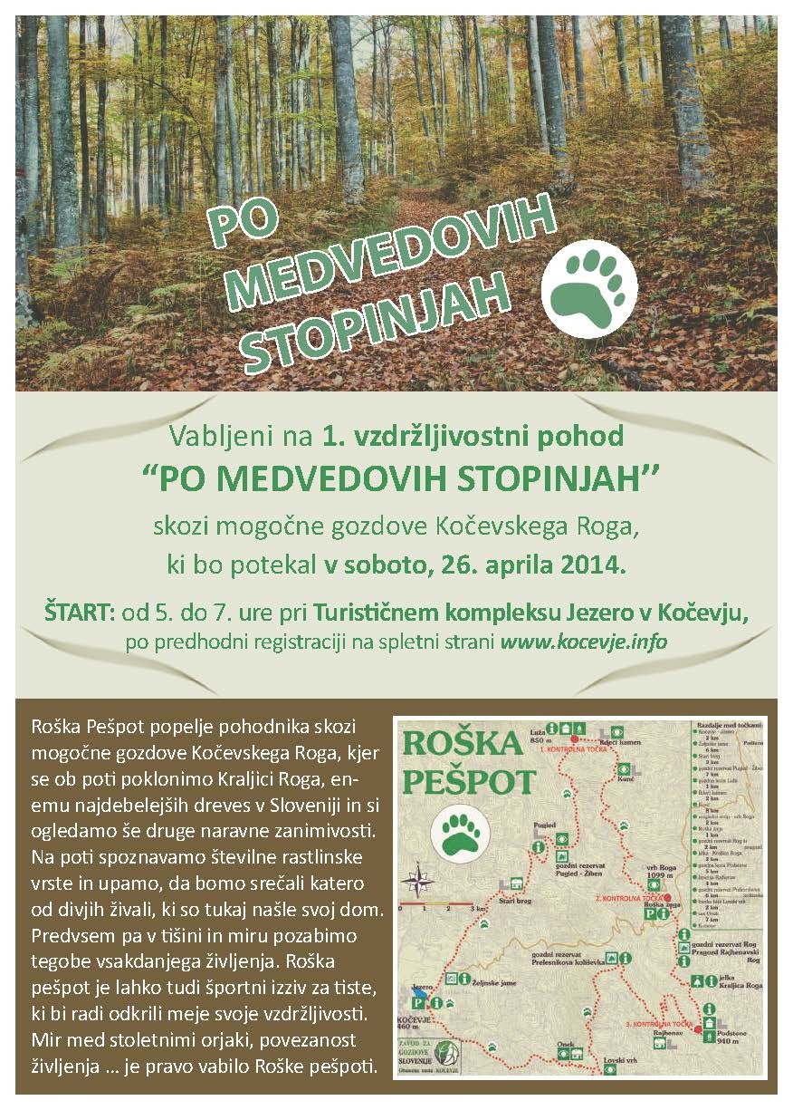26. 4. 2014 / Pohod, ogledov: 34491. vzdržljivostni pohod Po medvedovih stopinjah | Vrsta dogodka | Pohod | Območje | Dolenjska in Bela krajina | Kdaj | 26. 4. 2014 od 5. do 7. ure (začetek) | Kje | Kočevski Rog | Organizator | Turistično društvo Brezpotja | Prijave | do petka, 25. aprila, do 12. ure, na spletni strani www.kocevje.info. | Informacije | www.kocevje.info, info@kocevje.info, Franci Rupnik (041 338 167), Bojan Briški (040 234 715), Tone Krkovič (040 694 694) | Težavnost | Trasa poteka po gozdnih cestah, gozdnih poteh in le deloma (skupaj 5 km na začetku in na koncu) po javnih asfaltiranih cestah. Pot je enostavna, na njej ni nevarnih mest ali težjih vzponov ter spustov. | Primernost | Za fizično in psihično ustrezno pripravljene udeležence. | Trajanje/dolžina | 61 km | Cena | 10 EUR/ osebo (do 25. 4.), na dan pohoda: 15 EUR/ osebo. | Oprema / dokumenti | Primerna pohodniška oprema, predvsem dobri čevlji in čelna svetilka. Zaradi organizacijskih razlogov in varnosti pohodnikov je obvezna oprema mobilni telefon. | OSKRBA: na kontrolnih točkah bo organizator poskrbel za zadostne količine vode, na Žagi Rog (2. kontrolna točka) pa bo vsak udeleženec dobil toplo malico.