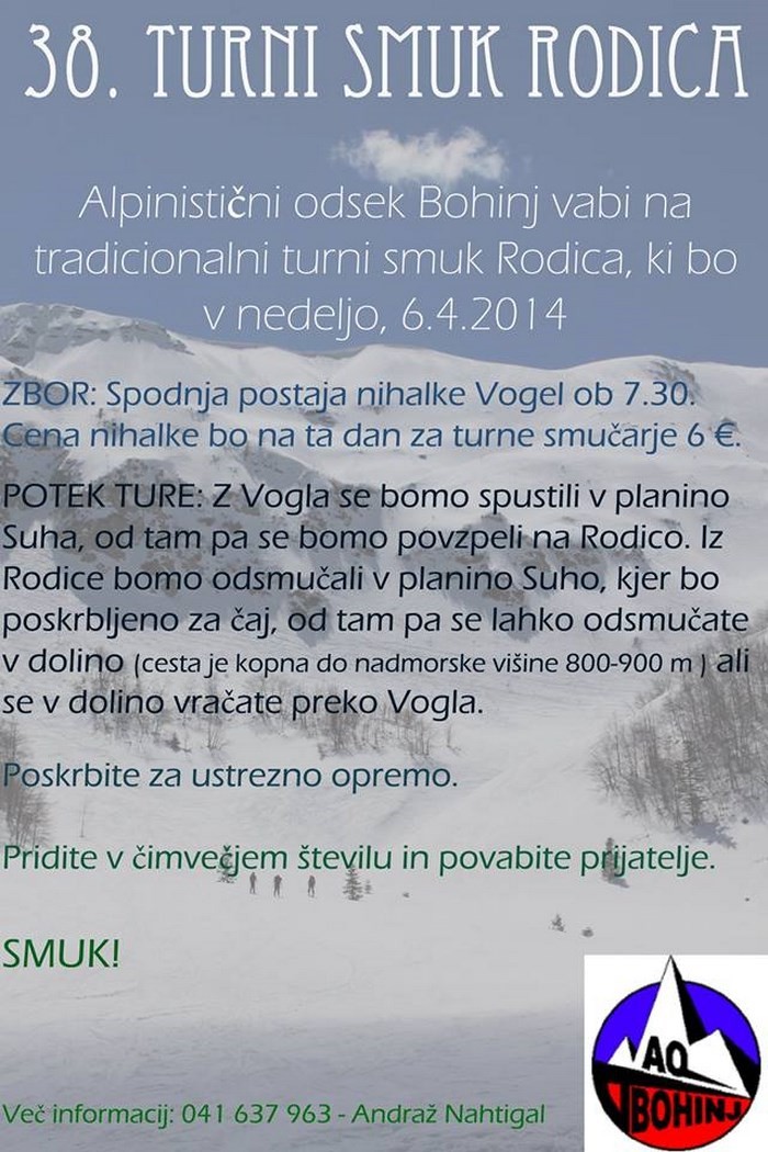 38. turni smuk Rodica | Vrsta dogodka | Turni smuk | Območje | Julijske Alpe | Kdaj | 6. 4. 2014 ob 7.30 na spodnji postaji nihalke Vogel (zbor) | Kje | Rodica | Društvo | Planinsko društvo Bohinjska Bistrica | Organizator | AO Bohinj | Informacije | 041 637 963 - Andraž Nahtigal, načelnik AO Bohinj | Oprema / dokumenti | turnosmučarska oprema | Alpinistični odsek Bohinj vabi na tradicionalni turni smuk Rodica