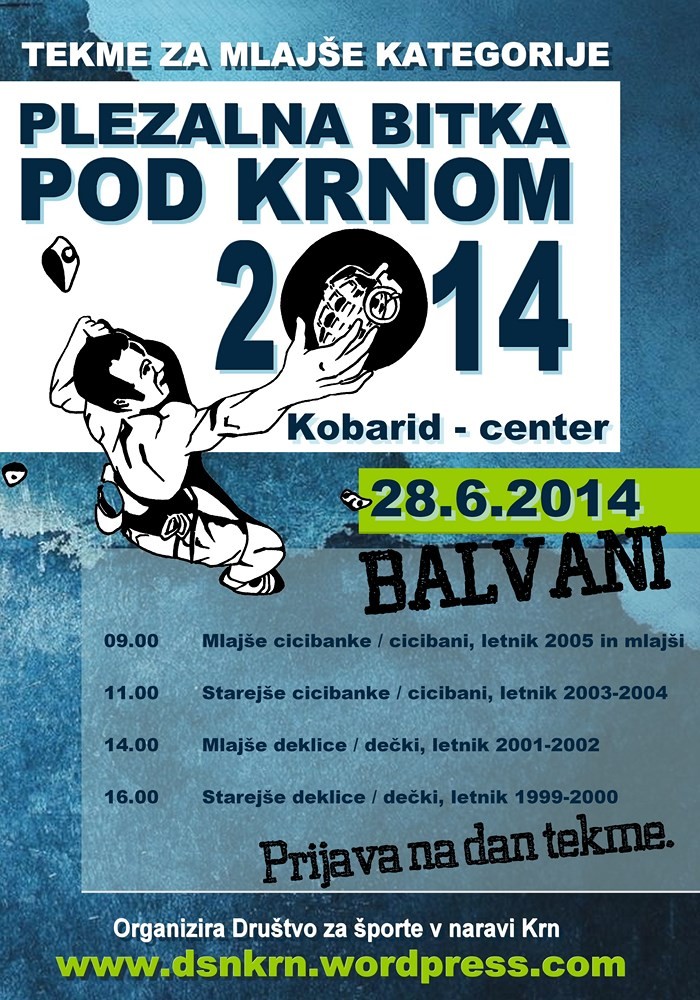 Plezalna bitka pod Krnom 2014 | Vrsta dogodka | Tekmovanje | Kdaj | 28. 6. 2014 | Kje | Kobarid - center | Organizator | Društvo za športe v naravi Krn | Prijave | Prijava na dan tekme. | Informacije | www.dsnkrn.wordpress.com | Plezalna bitka pod Krnom 2014 - tekma v balvanih za mlajše kategorije