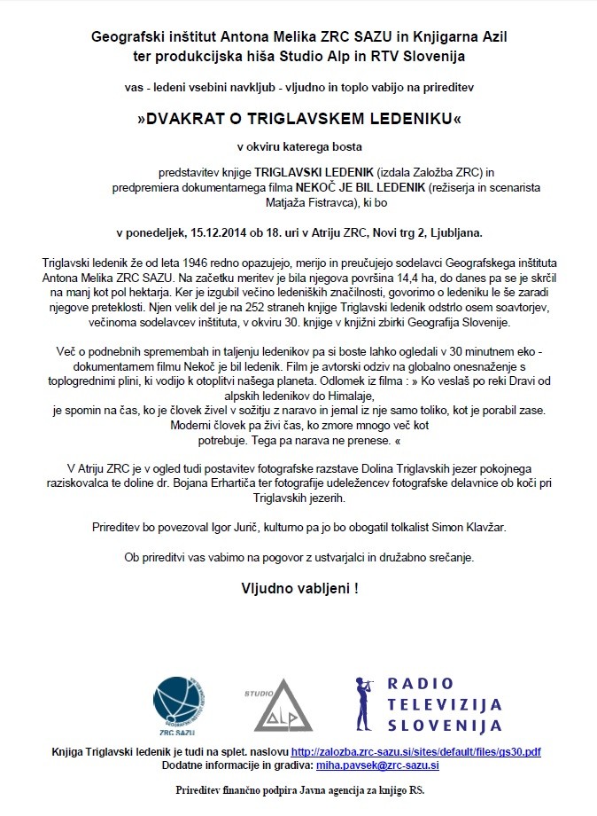 15. 12. 2014, ogledov: 1622DVAKRAT O TRIGLAVSKEM LEDENIKU | Kdaj | 15. 12. 2014 18 | Kje | Ljubljana | Organizator | Geografski inštitut Antona Melika ZRC SAZU, Knjigarna Azil, produkcijska hiša Studio Alp in RTV Slovenija |