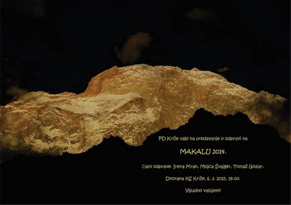 6. 3. 2015, ogledov: 1958Predavanje o odpravi Makalu 2014 | Kdaj | 6. 3. 2015 19:00 | Kje | Križe, dvorana krajevne skupnosti Križe | Društvo | Planinsko društvo Križe | O odpravi Makalu 2014 bodo govorili člani odprave Irena Mrak, Mojca Švajger in Tomaž Goslar. |