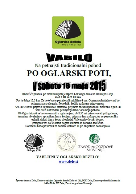 16. 5. 2015, ogledov: 190015. tradicionalni pohod po oglarski poti | Kdaj | 16. 5. 2015 med 7. in 9. uro pri Lovskem domu na Dolah pri Litiji |