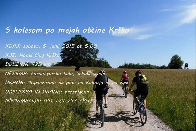 S kolesom po mejah občine Krško | Vrsta dogodka | Turnokolesarska tura | Območje | Posavsko hribovje | Kdaj | 6. 6. 2015 6:00, hotel City Krško | Kje | Krško | Društvo | Planinsko društvo Videm Krško | Organizator | društvo NaTuro | Vodnik / kontakt | Pia Peršič, telefon: 041 724 747 | Težavnost | za rekreativne kolesarje, ki se nam lahko pridružijo na posameznih etapah; celotna pot pa je za kondicijsko dobro pripravljene kolesarje | Trajanje/dolžina | 125 km | Način prevoza | lasten prevoz | Cena | udeležba je brezplačna | Ob počastitvi praznika občine Krško, organizirata društvo NaTuro in turno kolesarski odsek PD Videm Krško kolesarjenje po mejah občine Krško. Krška občina se naslanja na pobočjka Gorjancev in Bohorja, ravnino med njima pa razmejujeta Sava in Krka.